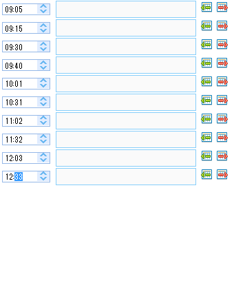 時刻入力にはjQuery EasyUIの時刻入力ボックスを利用している。後処理を簡単にするために、固有のID(固定文字列’tspn’+数値)を付与しておく。同様にスポット名には固有のID(‘txtspot’+数値)を、ボタンにも連番を振っておく。